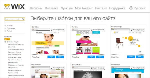 - Богатый выбор шаблонов оформления сайта, а также приложений расширяющих базовый функционал. При помощи WIX.com можно создавать достаточно продвинутые сайты, причем в визуальном формате без использования программирования;