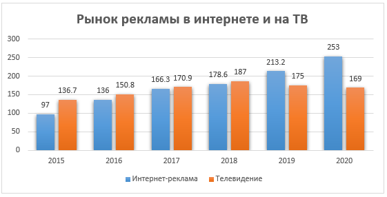 Начиная с 2019 года объем рекламы в интернете превышает объем рекламы на ТВ