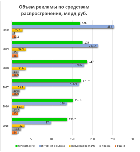 Начиная с 2020 года объем рекламы в интернете превышает все остальные виды рекламы