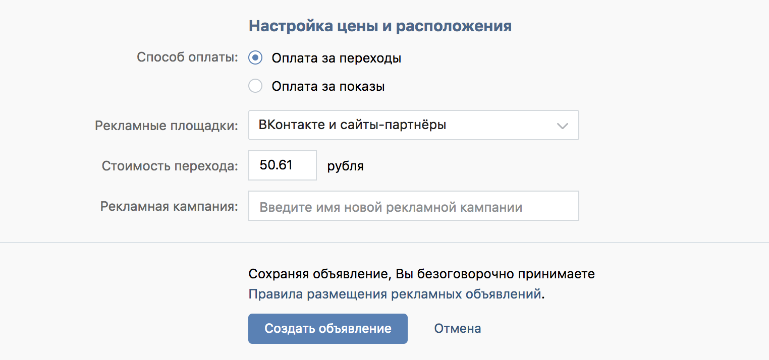 Для оплаты рекламы ВКонтакте есть два способа: оплата за переходы (CPC) и оплата за показы (CPM). Например, для CPM (плата за 1000 показов объявления) минимальная стоимость за рекламную запись и рекламу сайта составляет 30 рублей, за рекламу в историях — 50 рублей. При ставке за переходы по ссылке из объявления минимальная стоимость составляет 0.1 рубль для форматов «Рекламная запись» и «Реклама сайта».