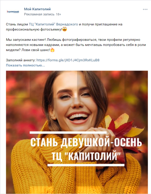 Пример рекламного объявления в VK, изображение с текстом