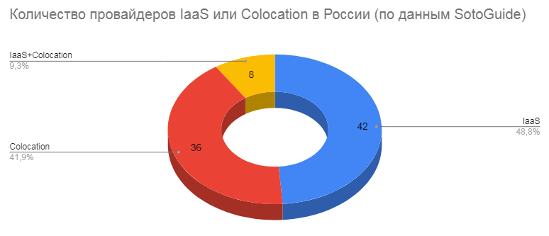 Любое облако "живет" в ЦОД. Поэтому было бы логично, чтобы коммерческие ЦОД помимо размещения серверов (Colocation) оказывали бы и услуги IaaS. Но статистика, собранная порталом SotoGuide, этого не подтверждает. Из 86 игроков рынка ЦОДами занимаются 36 компаний, а облаком - 42. Обе услуги оказывают всего 8 провайдеров.